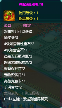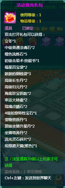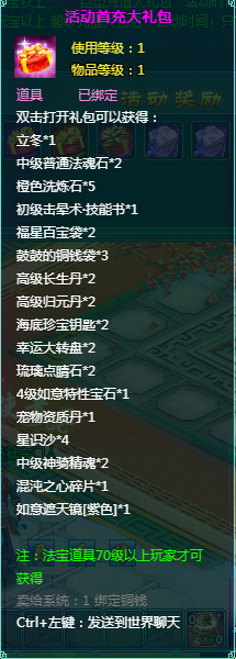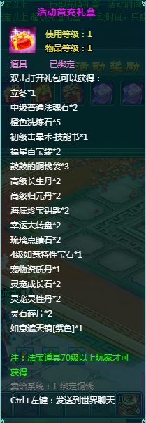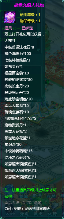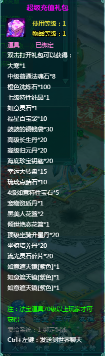 1、充值礼包中的法宝道具均为70级以上玩家才能获得。