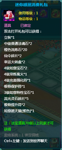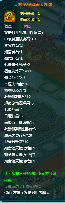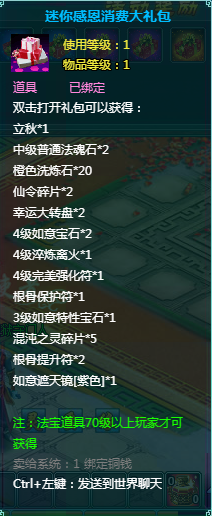1、消费礼包中的法宝道具等级70级以上玩家才可获得。