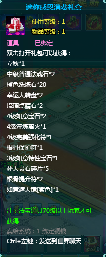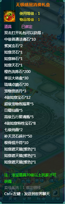 1、消费礼盒中的法宝道具等级70级以上玩家才可获得。