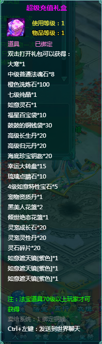 1、充值礼盒中的法宝道具均为70级以上玩家才能获得。