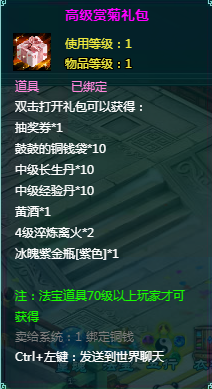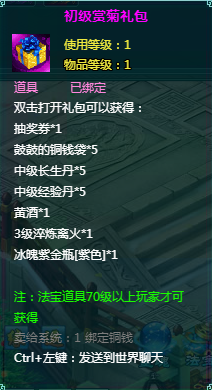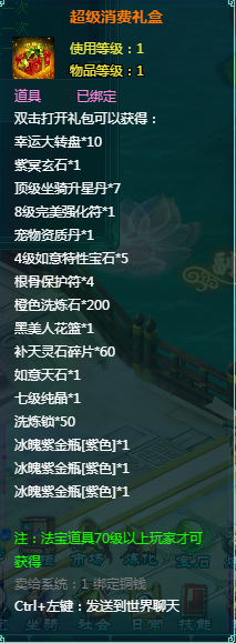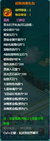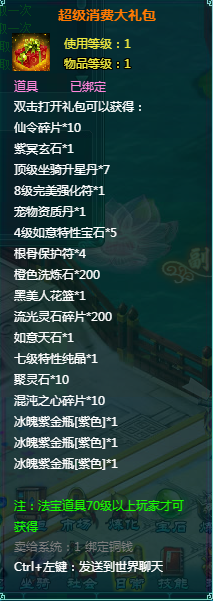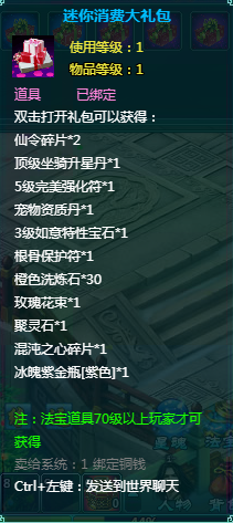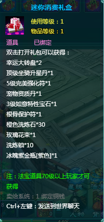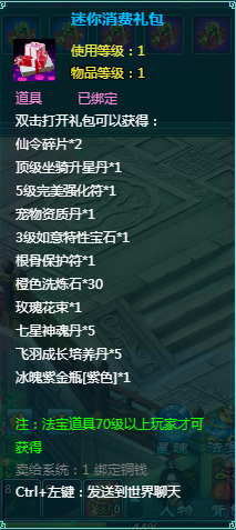 1、消费礼包中的法宝道具等级70级以上玩家才可获得。