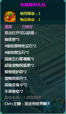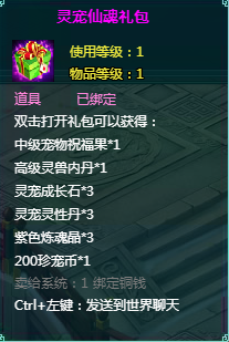 2、灵宠仙魂礼包:开启后获得:中级宠物祝福果*1、高级灵兽内丹*1、灵宠成长石*3、灵宠灵性丹*3、紫色炼魂晶*3、200珍宠币*1