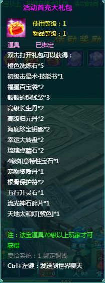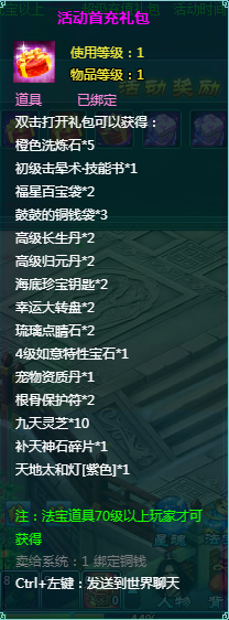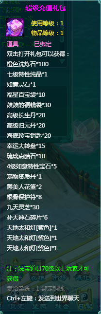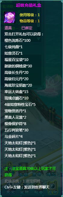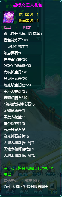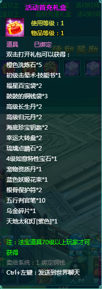 1、充值礼包中的法宝道具均为70级以上玩家才能获得。