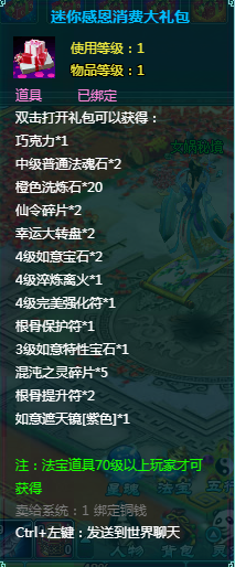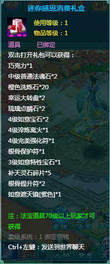 1、消费礼盒中的法宝道具等级70级以上玩家才可获得。
