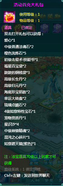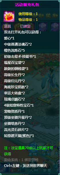 1、充值礼包中的法宝道具均为70级以上玩家才能获得。