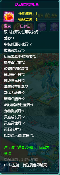 1、充值礼盒中的法宝道具均为70级以上玩家才能获得。