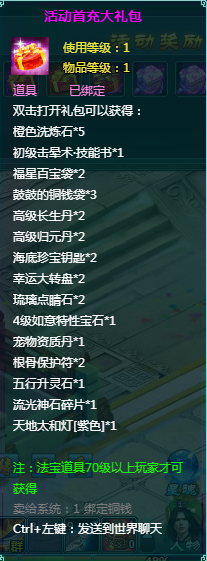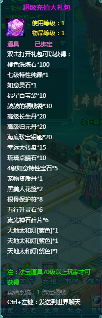 1、充值礼包中的法宝道具均为70级以上玩家才能获得。