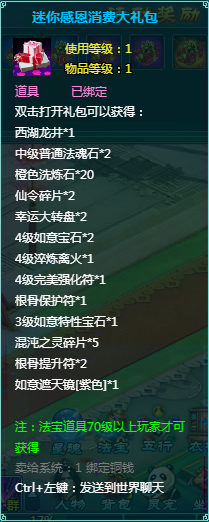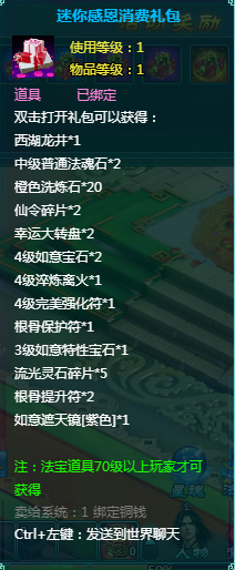 1、消费礼包中的法宝道具等级70级以上玩家才可获得。