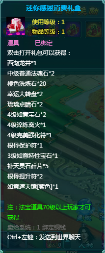 1、消费礼盒中的法宝道具等级70级以上玩家才可获得。