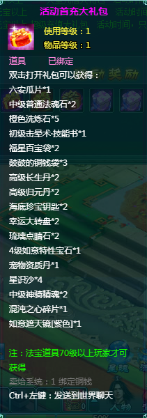 1、充值礼包中的法宝道具均为70级以上玩家才能获得。