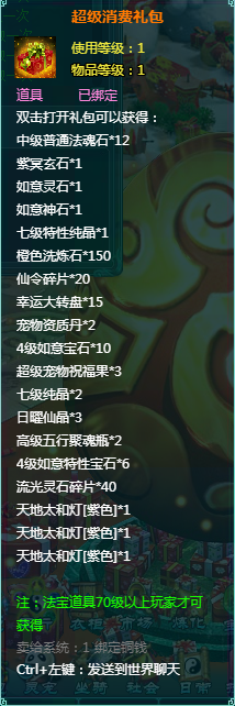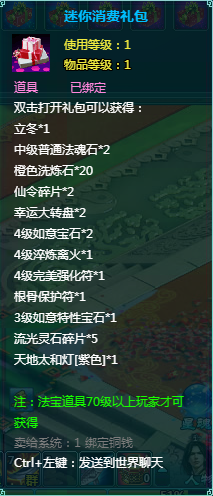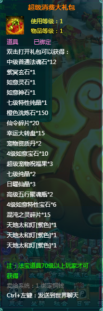 1、消费礼包中的法宝道具等级70级以上玩家才可获得。