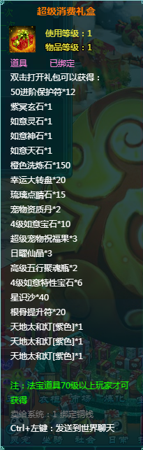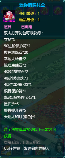 1、消费礼盒中的法宝道具等级70级以上玩家才可获得。