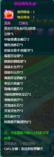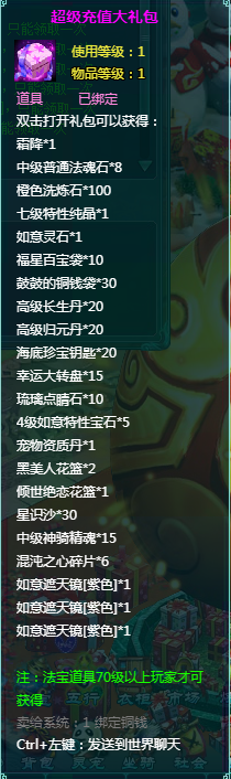 1、充值礼包中的法宝道具均为70级以上玩家才能获得。
