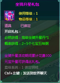 坐骑升星礼包:打开获得高级升星丹*1,有概率获得2~5个七宝五味粥