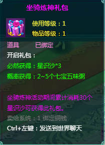 坐骑炼神礼包:打开获得坐骑星识沙*3,有概率获得2~5个七宝五味粥