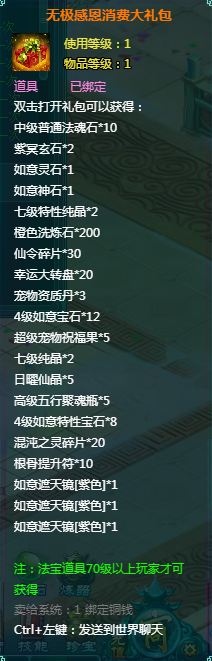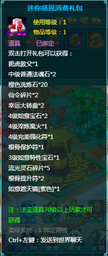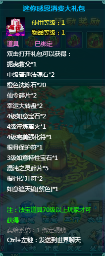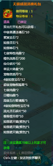 1、消费礼包中的法宝道具等级70级以上玩家才可获得。