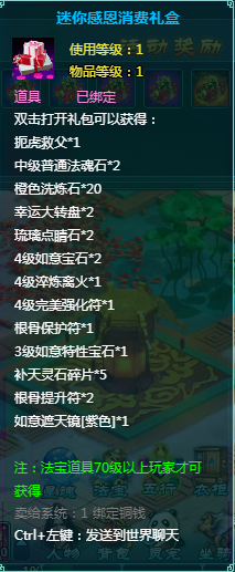 1、消费礼盒中的法宝道具等级70级以上玩家才可获得。
