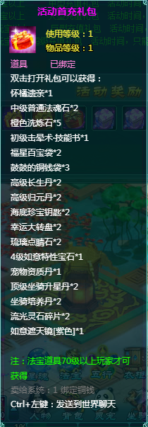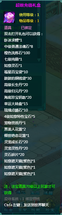 1、充值礼包中的法宝道具均为70级以上玩家才能获得。