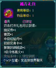 2、踏青礼包中的物品均为绑定道具,不可交易。