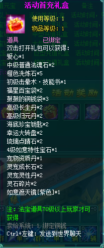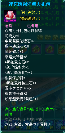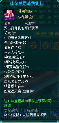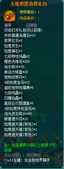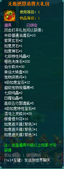 1、消费礼包中的法宝道具等级70级以上玩家才可获得。