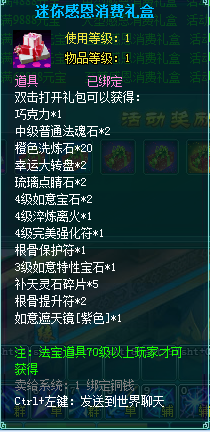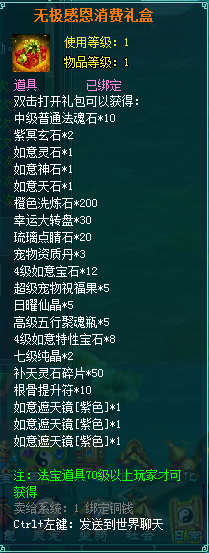 1、消费礼盒中的法宝道具等级70级以上玩家才可获得。