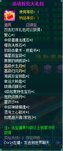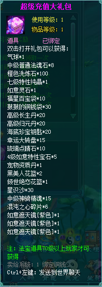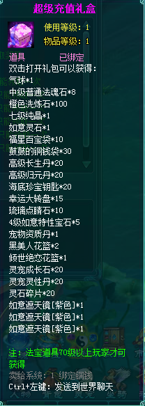 1、充值礼包中的法宝道具均为70级以上玩家才能获得。