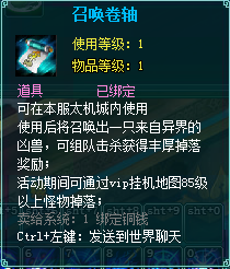 1、召唤卷轴只会在活动期间于vip挂机地图中85级以上怪物有掉落,均为绑定;