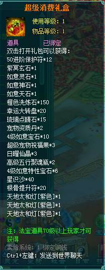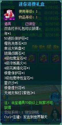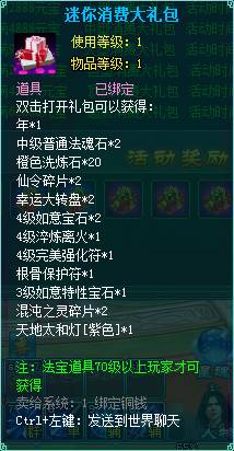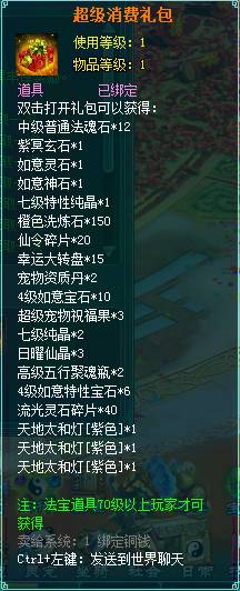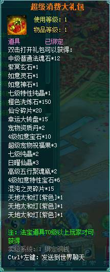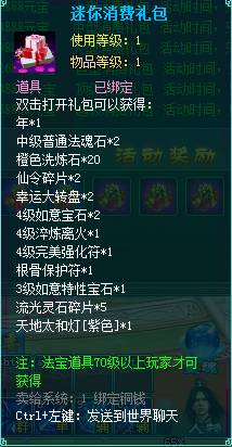1、消费礼包中的法宝道具等级70级以上玩家才可获得。