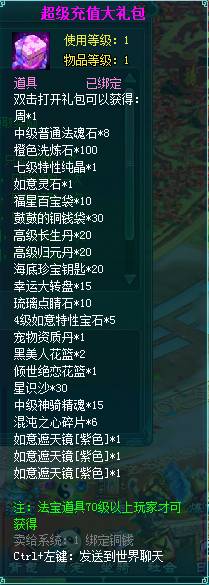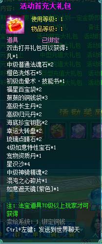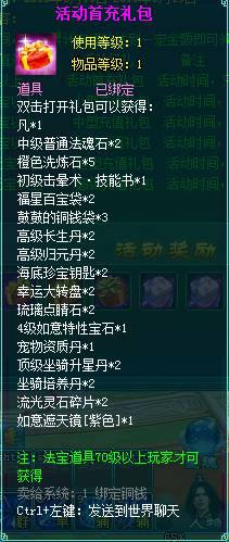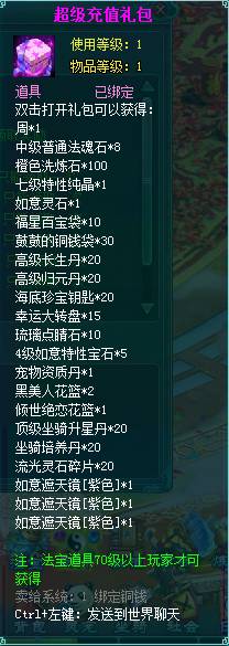 1、充值礼包中的法宝道具均为70级以上玩家才能获得。