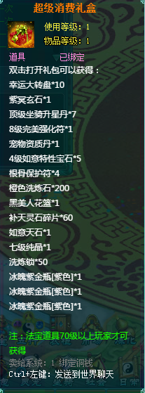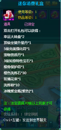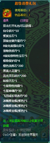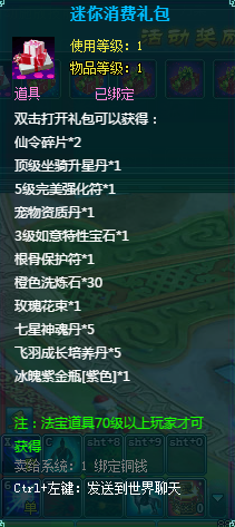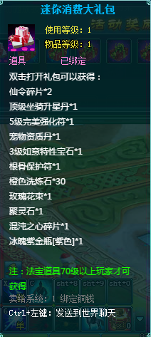 1、消费礼包中的法宝道具等级70级以上玩家才可获得。
