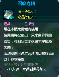 1、召唤卷轴只会在活动期间于vip挂机地图中85级以上怪物有掉落,均为绑定;