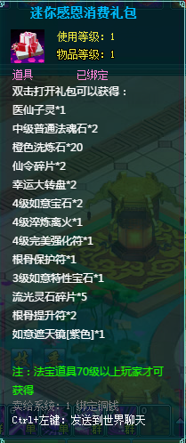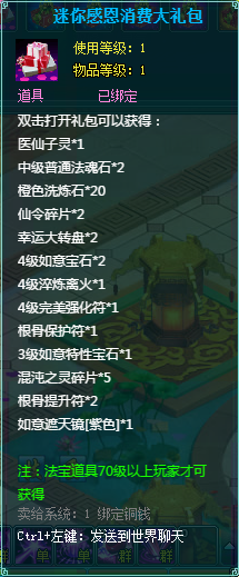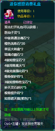 消费礼盒中的法宝道具等级70级以上玩家才可获得。