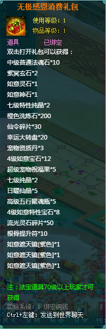 消费礼包中的法宝道具等级70级以上玩家才可获得。