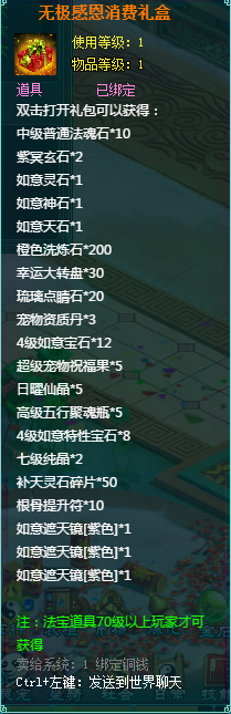 1、 充值礼盒中的法宝道具均为70级以上玩家才能获得。