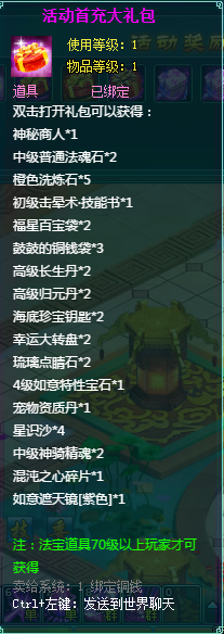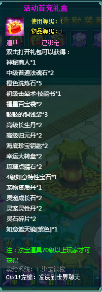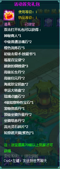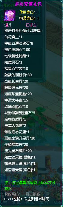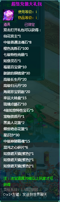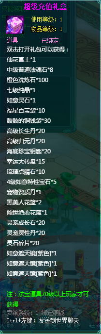 1、 充值礼包中的法宝道具均为70级以上玩家才能获得。
