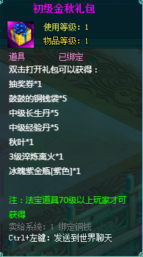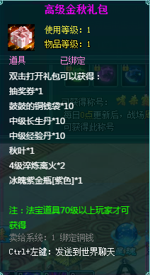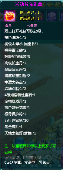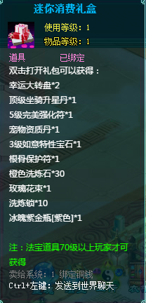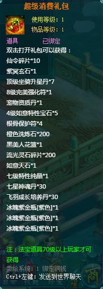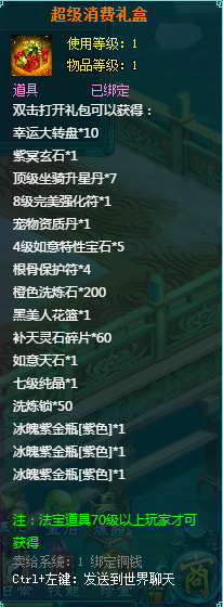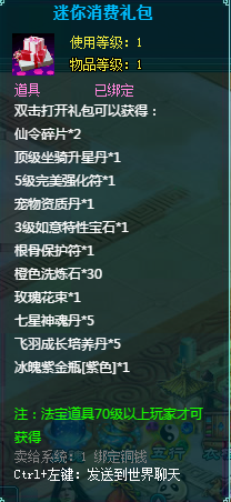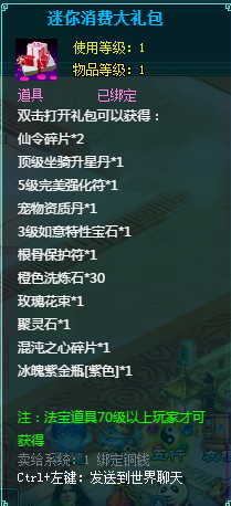 1、消费礼包中的法宝道具等级70级以上玩家才可获得。