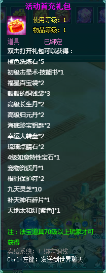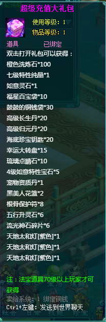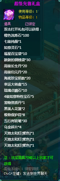 1、充值礼包中的法宝道具均为70级以上玩家才能获得。