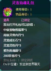 回归大礼包3:铜钱*50000、绑定元宝*30、天佑碎片*5、灵石碎片*20、60进阶保护符*2、千年玄铁*2、洗炼锁*20、中级五行聚魂瓶*1、远古残魂*5、小型灵宠资质丹*1。