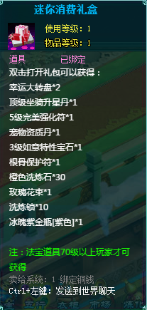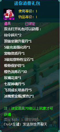 1、消费礼包中的法宝道具等级70级以上玩家才可获得。
