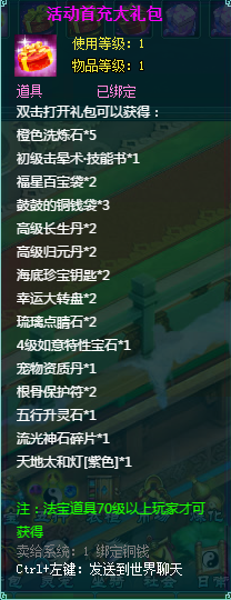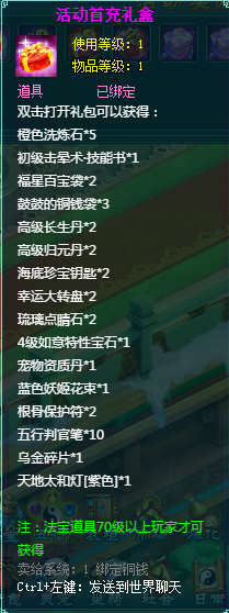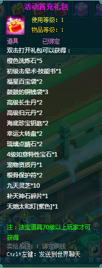 1、充值礼包中的法宝道具均为70级以上玩家才能获得。