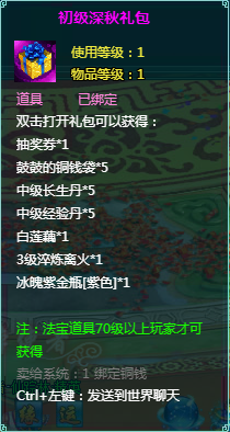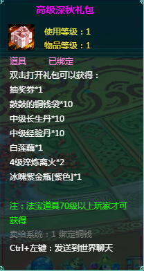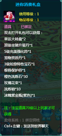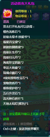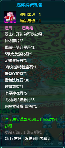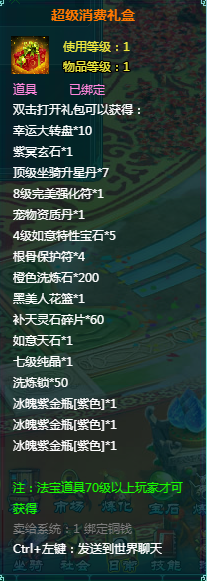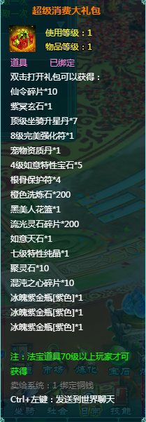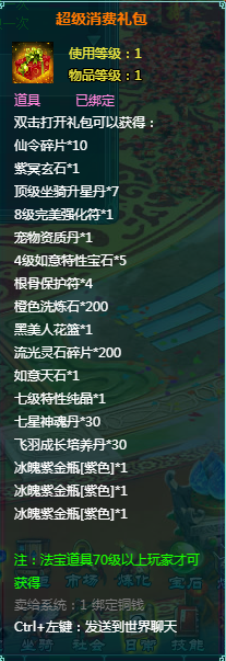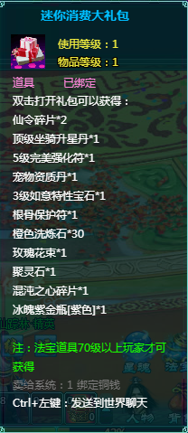 1、消费礼包中的法宝道具等级70级以上玩家才可获得。