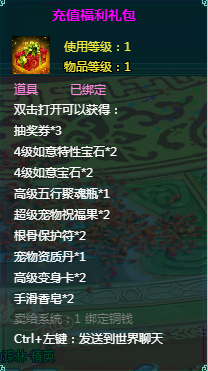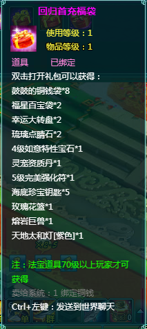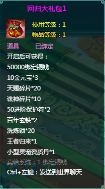 回归大礼包3:铜钱*50000、绑定元宝*30、天佑碎片*5、灵石碎片*20、60进阶保护符*2、千年玄铁*2、洗炼锁*20、中级五行聚魂瓶*1、远古残魂*5、小型灵宠资质丹*1。