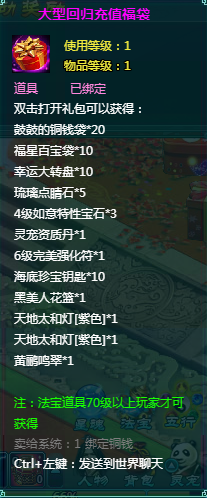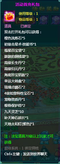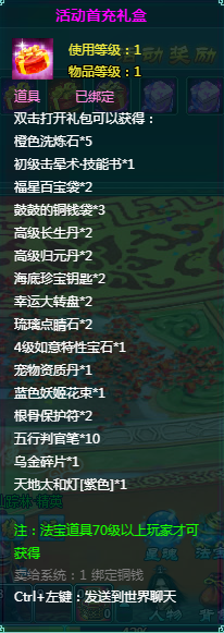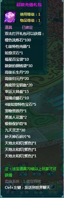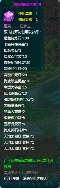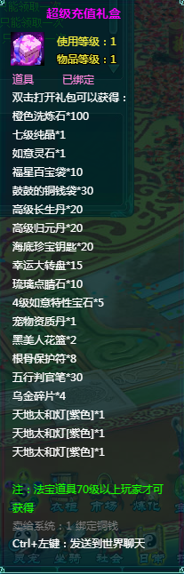 1、充值礼包中的法宝道具均为70级以上玩家才能获得。