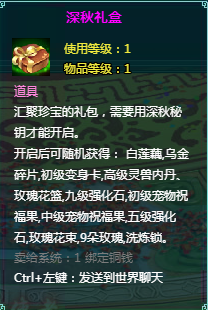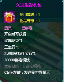 久别重逢礼包:庆典蛋糕束*1、三生石*1、2级如意特性宝石*1、30000铜钱。老玩家可领取,每天可领取1个。