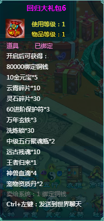 回归大礼包6:铜钱*80000、绑定元宝*50、云霄碎片*10、灵石碎片*30、60进阶保护符*3、万年玄铁*3、洗炼锁*30、高级五行聚魂瓶*2、远古残魂*10、神兽血滴*4、宠物资质丹*2。