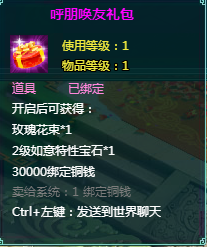 呼朋唤友礼包:庆典蛋糕束*1、2级如意特性宝石*1、30000铜钱。被绑定好友可获得。每绑定一个老玩家可获得一个。可重复获得,最多可被10个老玩家绑定。