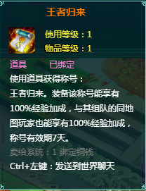 5,拥有“王者归来”称号的玩家在任何时间都能享有100%的经验加成。