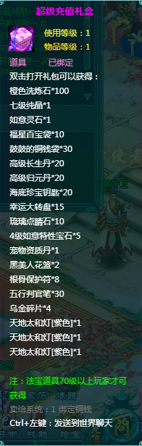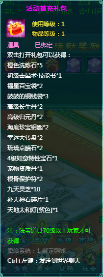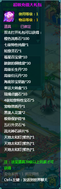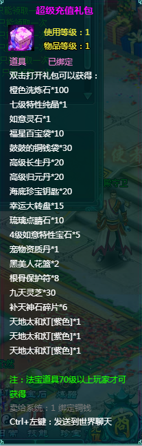 1、充值礼包中的法宝道具均为70级以上玩家才能获得。