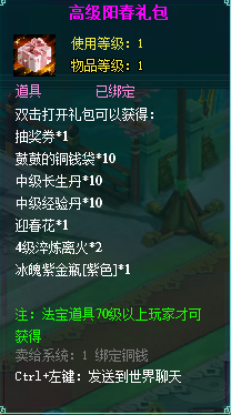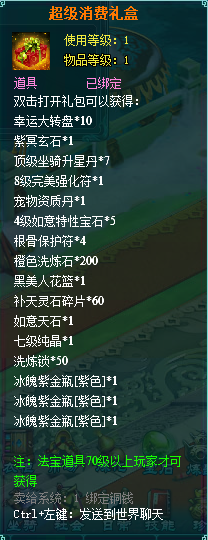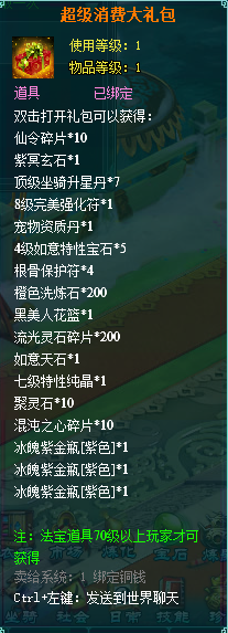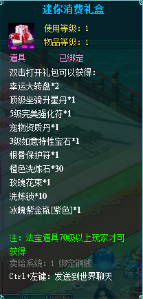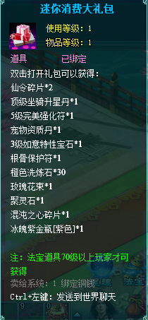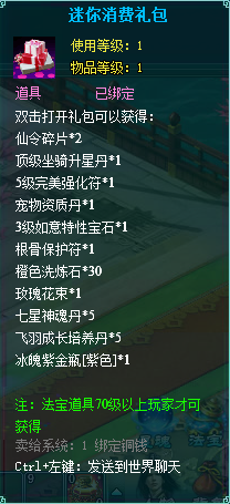 1、消费礼包中的法宝道具等级70级以上玩家才可获得。