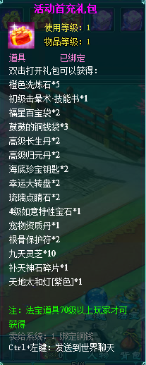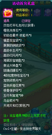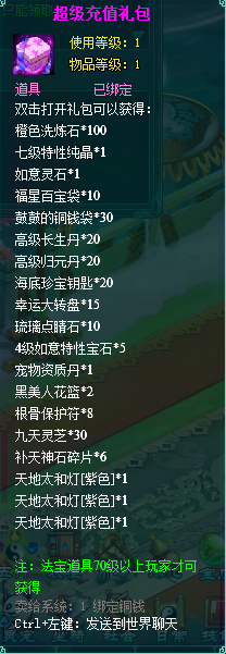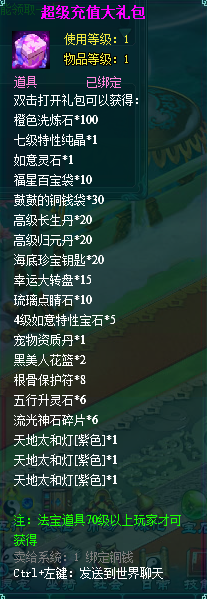 1、充值礼包中的法宝道具均为70级以上玩家才能获得。